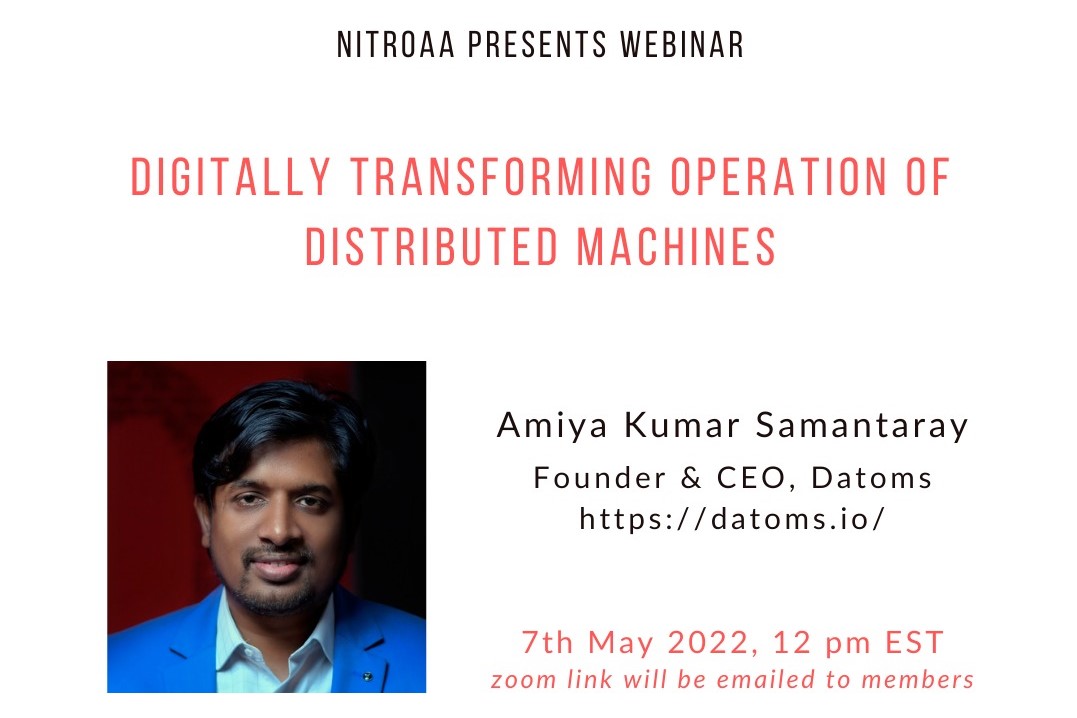 Abstract: Datoms (www.phoenixrobotix.com), a NITR startup aims to be the preferred Operating System for Distributed Machines in Assets-Intensive Industries. This webinar will give you an overview of how Datoms is building connected machine tech to simplify the operation management for the construction, warehouses, and agriculture industries. You will also hear the journey from the inception of Datoms on the NITR campus to the expansion of the company to more than 5 countries today. Speaker bio: Amiya Kumar Samantaray is Founder and CEO of Datoms and is an alumnus of NITR (class of 2014). Datoms is the first startup of NIT Rourkela that incubated and grew out of the campus. He is a fellow member of the Royal Academy of Engineering, UK. He was felicitated by the President and the Communication Minister of India in 2017 for winning a challenge by Intel – “Innovate for Digital India Challenge”. He was awarded the title of “Best Engineer” in the area of Green Energy for Engineering Excellence by Nalco Ltd. Amiya being a hustler envisions creating a mark in the world by building a global product company out of India.