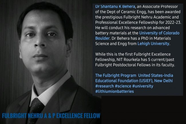 Dr. Shantanu Behera of Dept. of Ceramic Engg., NIT Rourkela, has been awarded the prestigious Fulbright Nehru Academic and Professional Excellence Fellowship for 2022-23. He will carry out his work at the University of Colorado Boulder on materials for lithium-ion batteries. Congratulations and best wishes for a successful US sojourn.